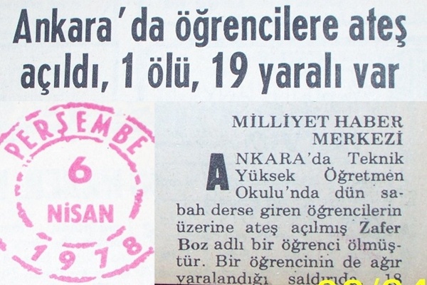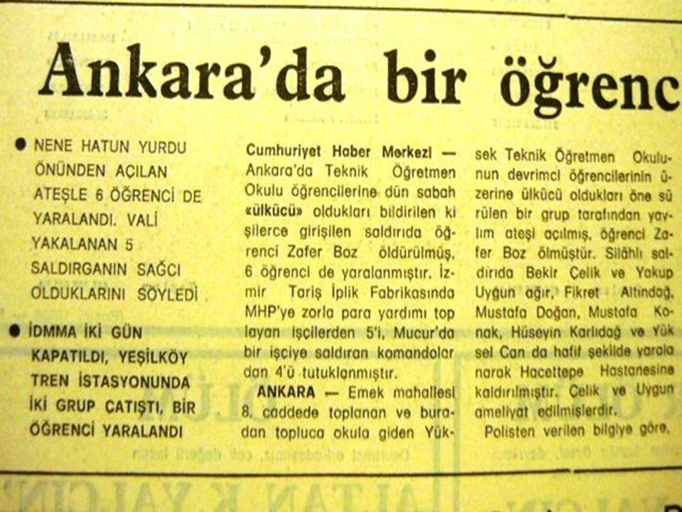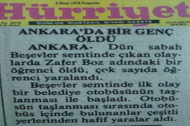 Zafer, o sabah ilk defa gruba katılıp, grupla birlikte okula gidecekti. Grupla okula giden arkadaşlarından çok dinlemişti ama bu onun için ilkti, bu yüzden tedirgindi, heyecanlıydı. İçinde bulunduğu dolmuş taksi İlahiyat Fakültesinin köşesinde kanlı katiller tarafından durdurulunca önce ne olduğunu anlamadı, şaşırdı sonra da kapıyı açıp biran önce gruba katılabilmek için birden İsrail evlerine doğru koşmaya başladı. Orta boylu esmer bir faşist topal bacağını birkaç adım sektirip bir arabanın altına yatarak etrafı taramaya başladı. Zafer önce yüreğinde ateş gibi yakan derin bir acı hissetti sonra da düşüp kaldı.